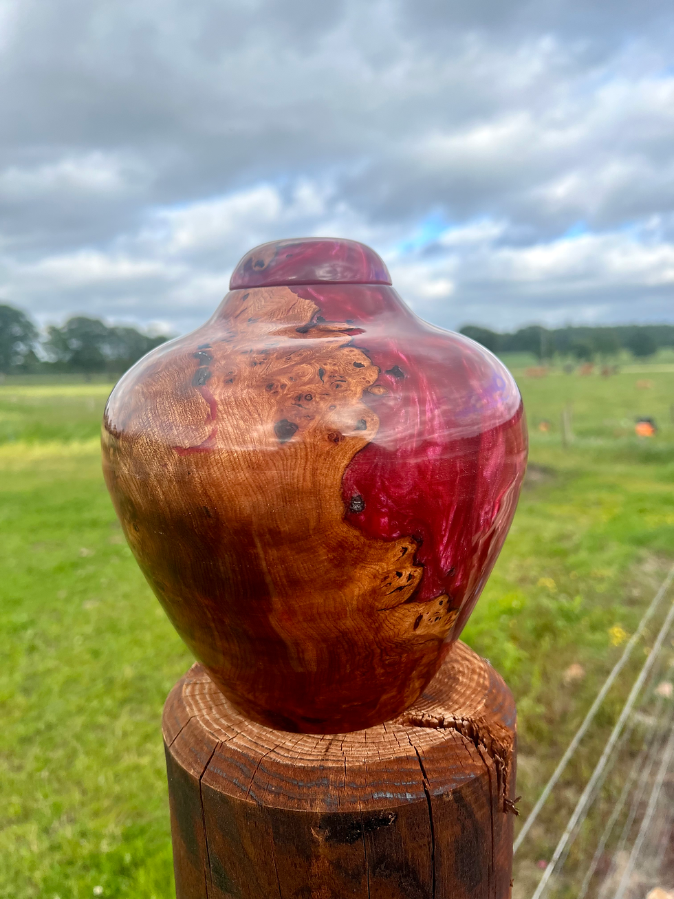 ![]() Elm burr and purple resin vase. Carved on the lathe and coated several times. this coating ensures the piece can withold water, therefore allowing it to be used for live flowers | ![]() Elm burr vase with live edge. Carved on the lathe and coated several times. this coating ensures the piece can withold water, therefore allowing it to be used for live flowers |